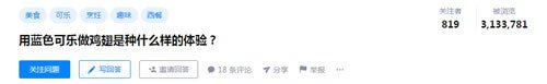 我看到某个美食号发了一个用蓝色可乐做鸡翅的视频,我觉得很有意思就点开看了起来,看完之后我干的第一件事就是在知乎上查看有没有相关问题,立马就提问邀请自己的大号来回答: