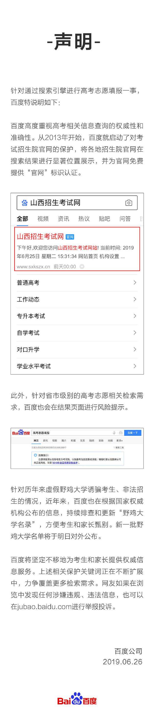 6月26日下午消息,针对通过搜索引擎进行高考志愿填报一事,百度今日在微博上发布声明表示,从2013年开始,百度就启动了对考试招生院官网的保护,将各地招生院官网在搜索结果进行显著位置展示,并为官网免费提供“官网”标识认证。