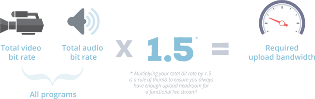 将您的总比特率乘以1.5是一个经验法则,我们建议始终拥有大约1.5倍的流的比特率,以解决这些可能的网络波动。例如,如果您直播流的比特率为5 Mb / s,则确保您拥有至少7.5 Mb / s的上传带宽,以确保可靠的直播。