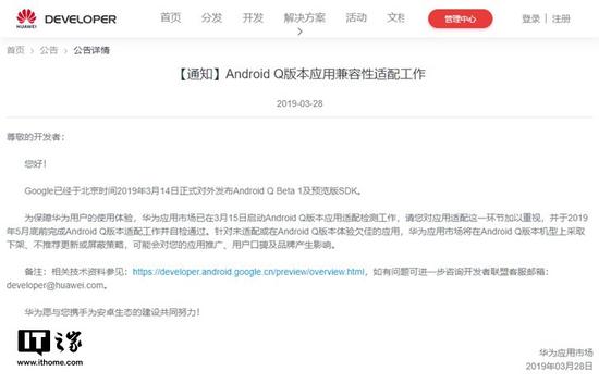 华为在其开发者网站发布公告称,谷歌已经于北京时间2019年3月14日正式对外发布Android Q Beta 1及预览版SDK,为保障用户的使用体验,华为应用市场已在3月15日启动Android Q版本应用适配检测工作。