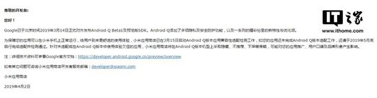另据IT之家读者提供的截图显示,小米应用商店也于4月2日向开发者发送了邮件,同样表示已启动Android Q版本应用适配检测工作,督促开发者在5月底前完成Android Q适配工作。