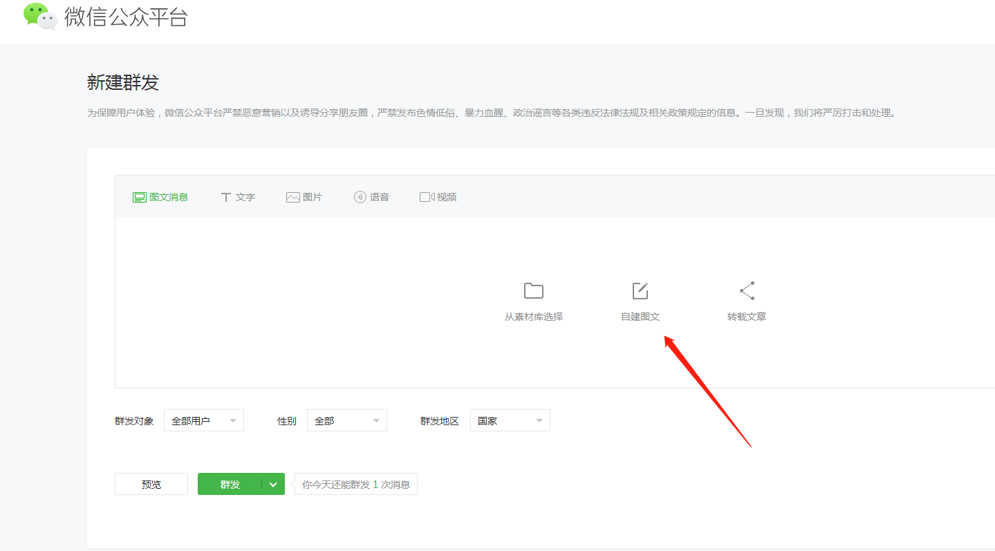 2、登录公众号,进入到首页,点击“新建群发”,然后再点击“自建图文”。
