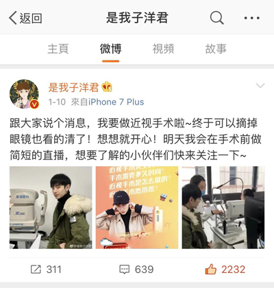 微博人气小哥哥@是我子洋君是原创类视频博主,创造过很多搞笑视频,深受网友喜爱。子洋君也是一个双眼500度近视患者,为了更好的演绎自己的作品,他都会选择隐形眼镜出镜。拍摄期间长期佩戴,时间一长眼睛非常不舒服,也会引起眼干等问题,子洋君非常期待能够通过近视手术矫正视力,摆脱眼镜困扰。