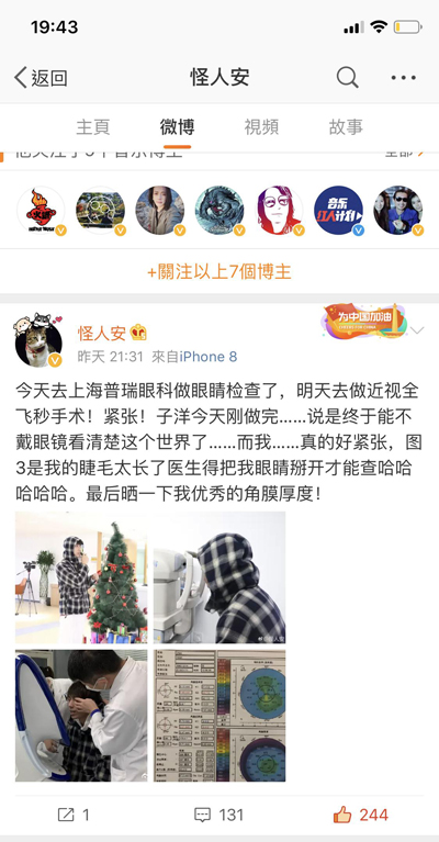 2019年1月11、12日,微博大咖搞笑达人@是我子洋君、@yp杨英鹏,重选乐队主唱@怪人安,3位百万级微博大V齐聚普瑞眼科接受全飞秒近视手术摘镜,并通过网络直播平台,同步直播检查-手术-复查全过程,向微博网友全程高清直播了手术过程,揭开了全飞秒近视手术的奥秘。